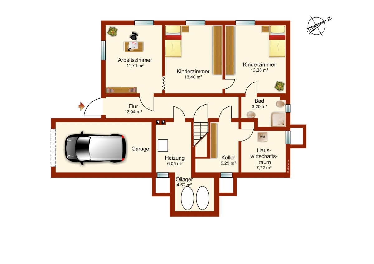 Erdgeschoss: Arbeitszimmer, 2 Kinderzimmer, Bad (Dusche, WC), Hauswirtschaftsraum, Heizungsraum, Keller, Flur
