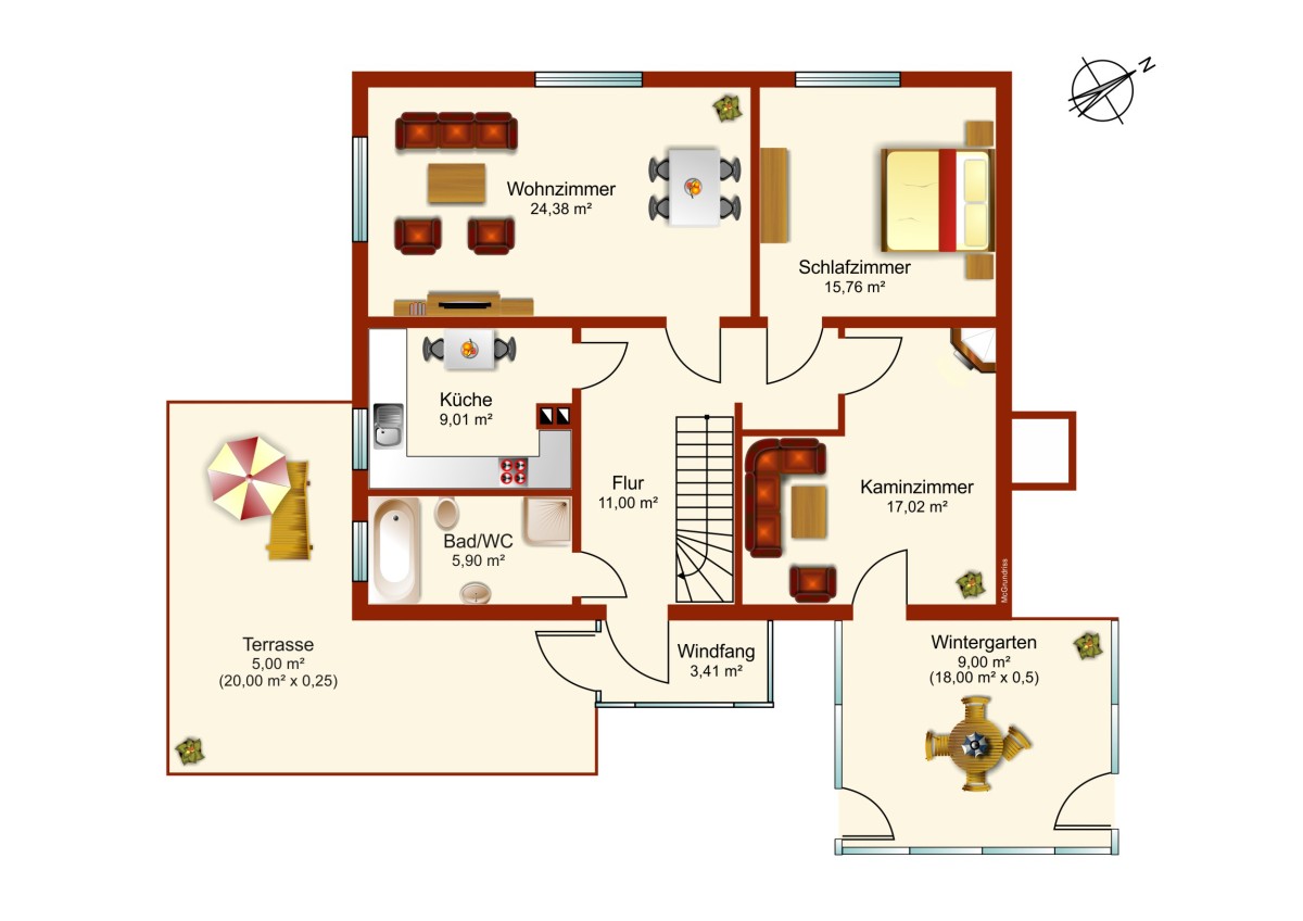 Obergeschoss: Wohnzimmer, Schlafzimmer, Kaminzimmer, Küche, Bad (Wanne, Dusche, WC), Flur, Windfang, Wintergarten, Terrasse