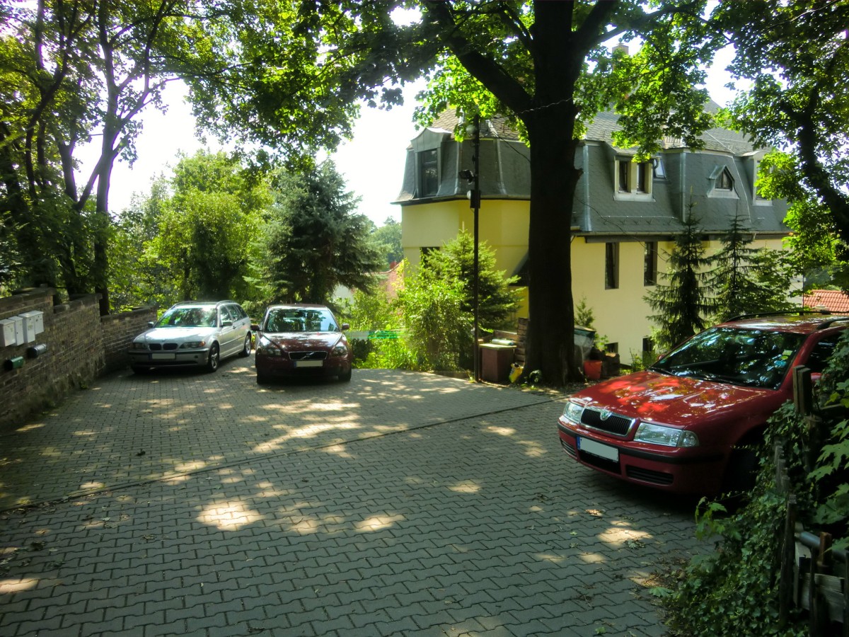 Der Zugang zum Grundstück erfolgte früher nur über eine Treppe. Zwischenzeitlich wurde jedoch eine Pkw-Zufahrt über das Nachbargrundstück angelegt und durch ein Wegerecht im Grundbuch gesichert. Der obere Teil der Zufahrt erhielt dabei ein neues Pflaster. Der Weg führt bis ans Haus. Hier stehen 4 Pkw-Parkplätze zur Verfügung, jeweils ein Platz pro Wohnung.