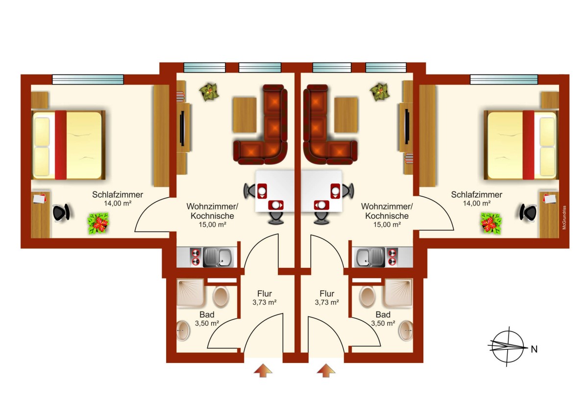 Bei Bedarf kann die direkt danebenliegende Wohnung ebenfalls erworben werden, was die Möglichkeit einer Verbindung beider Wohnungen bietet. Diese Wohnung ist gleich groß und identisch aufgeteilt, jedoch spiegelbildlich angeordnet. Dieser Kauf ist optional.