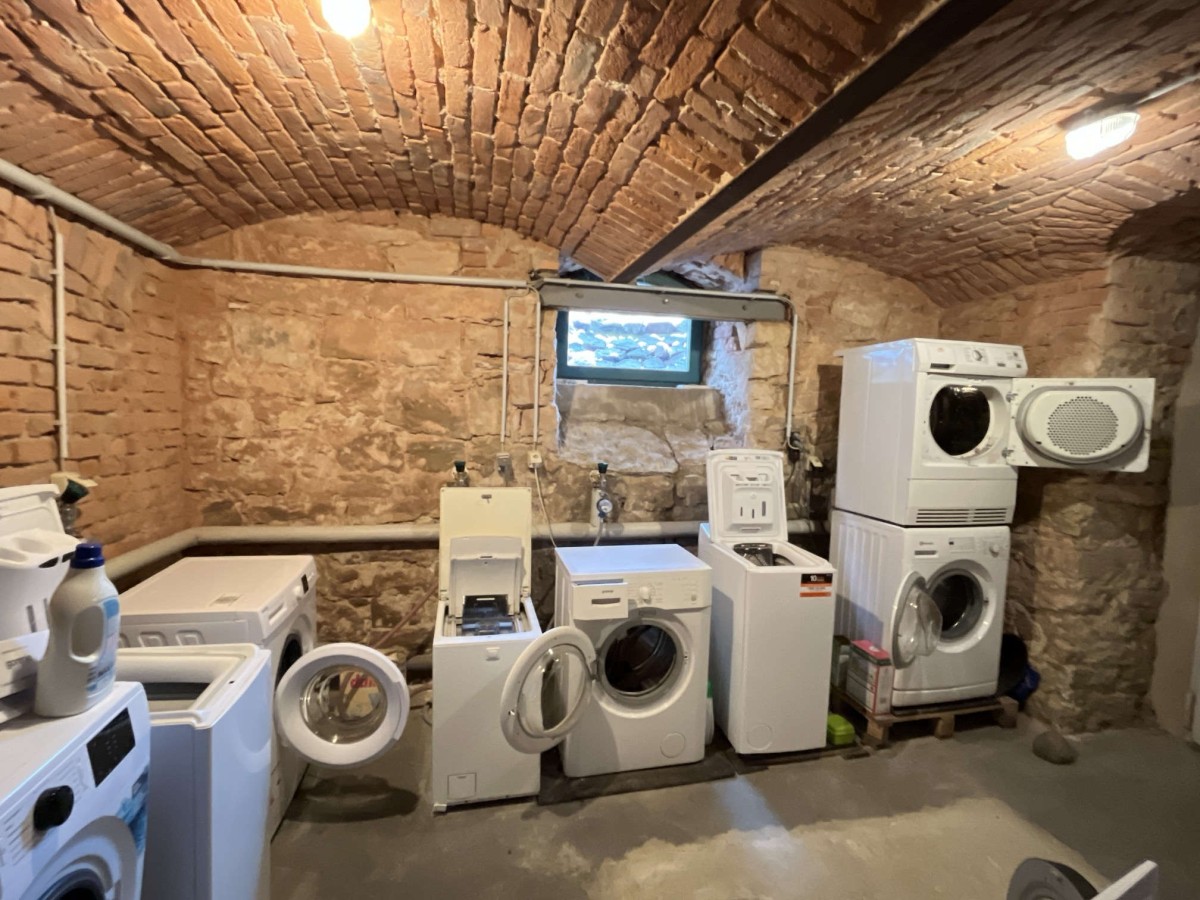Das Treppenhaus und der Platz vor der Wohnungstür sind, wie zur Bauzeit damals oft üblich, großzügig bemessen. Über einen kleinen Flur wir die Wohnung betreten, hier befindet sich der Zugang zum Bad. Im Frühjahr 2024 wurde im Bad eine neue Dusche mit einem niedrigen Einstieg installiert. Das Wohnzimmer verfügt über eine kleine, offene Küche. In das Schlafzimmer gelangt man direkt vom Wohnzimmer aus. Zur Wohnung gehören weiterhin ein eigener Kellerraum und ein Platz für die Waschmaschine im Waschraum.