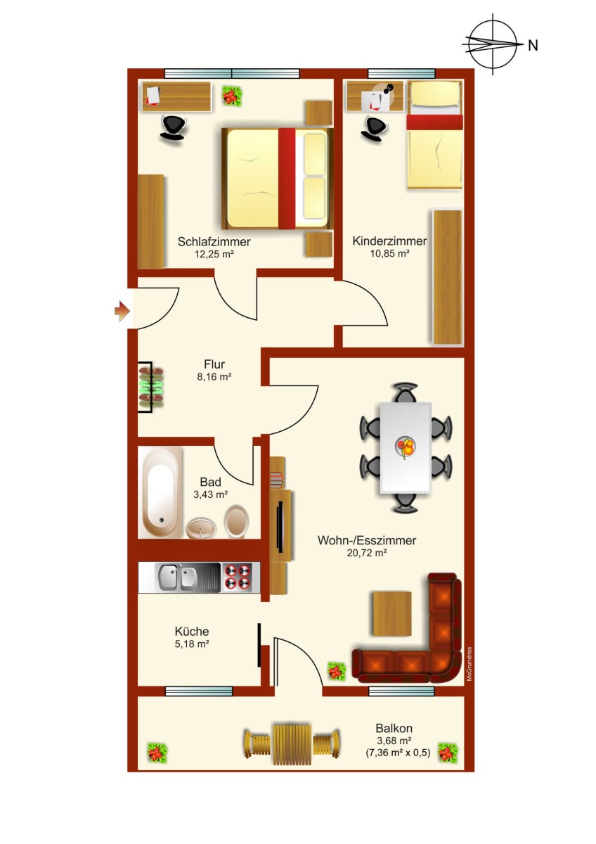 3 Zimmer, Küche, Bad (Wanne, WC), Balkon, Kellerraum