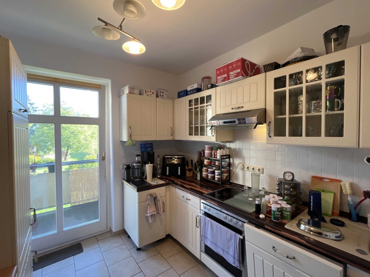 Der Balkon an der Küche bietet einen schönen Blick in die großzügige Grünanlage zwischen den Häusern, in der Ferne ist sogar der Fernsehturm zu sehen. Die Wohnung besitzt Holzfenster mit Sprossen und ist ein einem gepflegten Zustand. In der Wohnung wurde zuletzt 2020 im Bad der Fußboden neu gefliest und 2025 der Spülkasten des WC ersetzt.