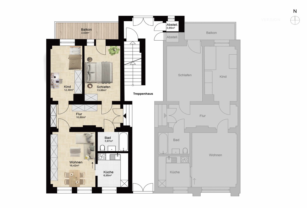Wohnzimmer, Schlafzimmer, Kinderzimmer, Flur, Küche, Bad (Wanne, WC, WM), Balkon, Abstellraum im Treppenhaus, Kellerraum