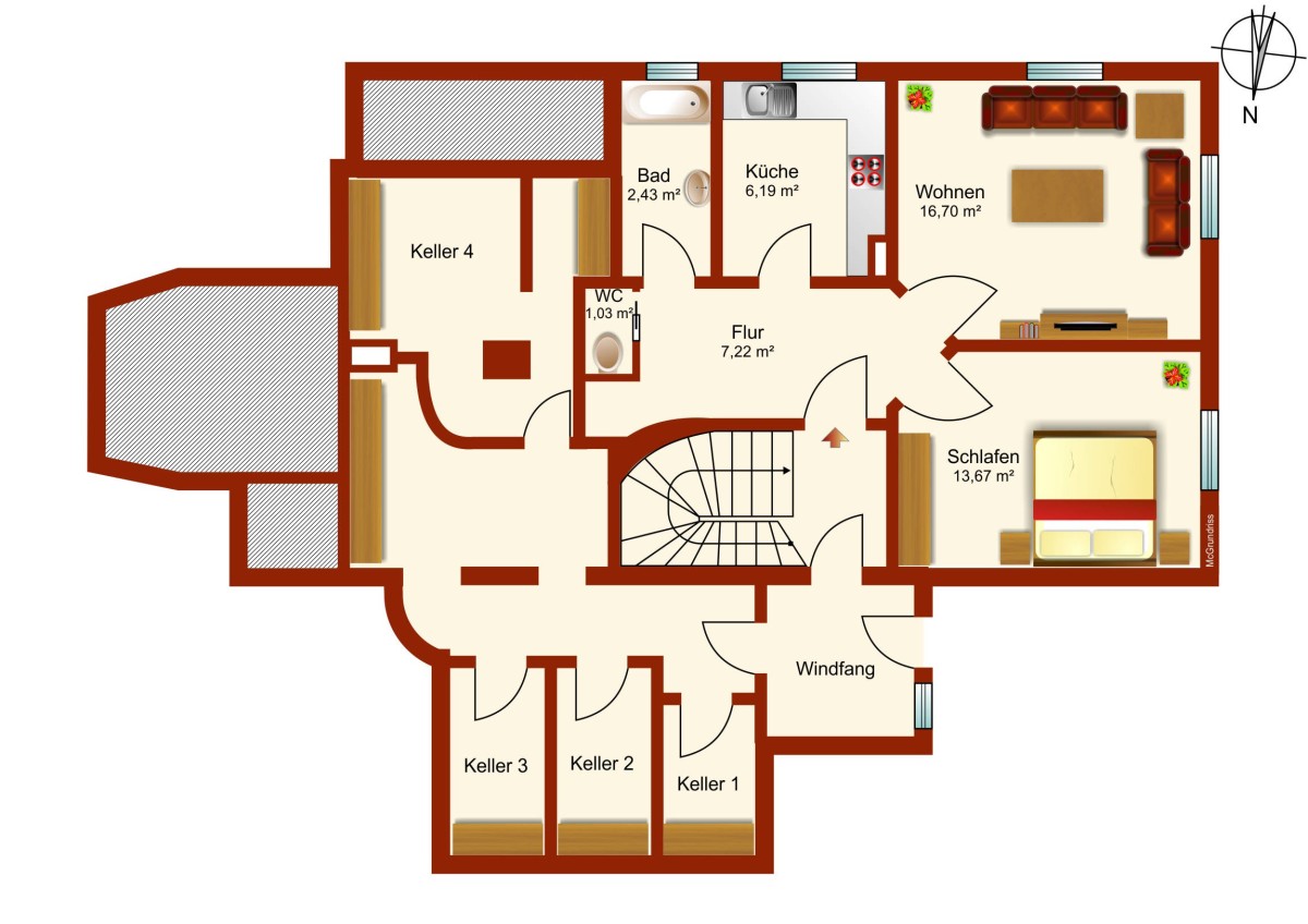 Wohnzimmer, Schlafzimmer, Bad, WC, Flur, Küche